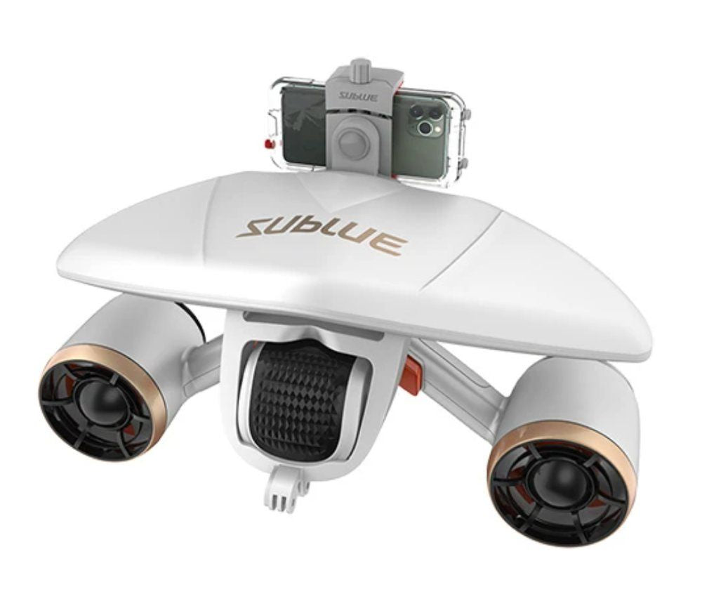 WhiteShark MixPro is the smallest Sublue double propeller, ultra-lightweight and compact underwater scooter, it can reach up to 6.4km/h and lasts up to 60 minutes on a single charge. Upgrades have been made on SPEED, RUN-TIME and FEATURES see the comparison to the WhiteShark Mix.